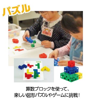 「ウッディキューブ」は数能力を養うのに最適な教具です。見えない積み木の数をイメージしたり、ブロック単位で合成・分解することにより、数の成り立ち、位取り、掛け算、割り算、分数の基礎能力 の育成に驚異的な成果を発揮します。